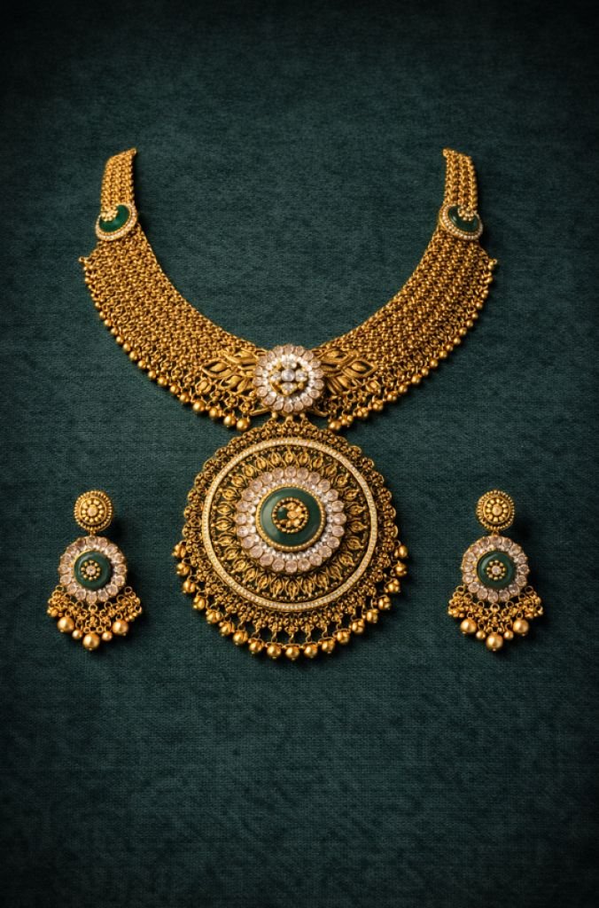 A royal antique choker set crafted in 92.5 silver with gold plating, featuring a grand circular green kundan pendant and intricate detailing—perfect for bridal and festive occasions.