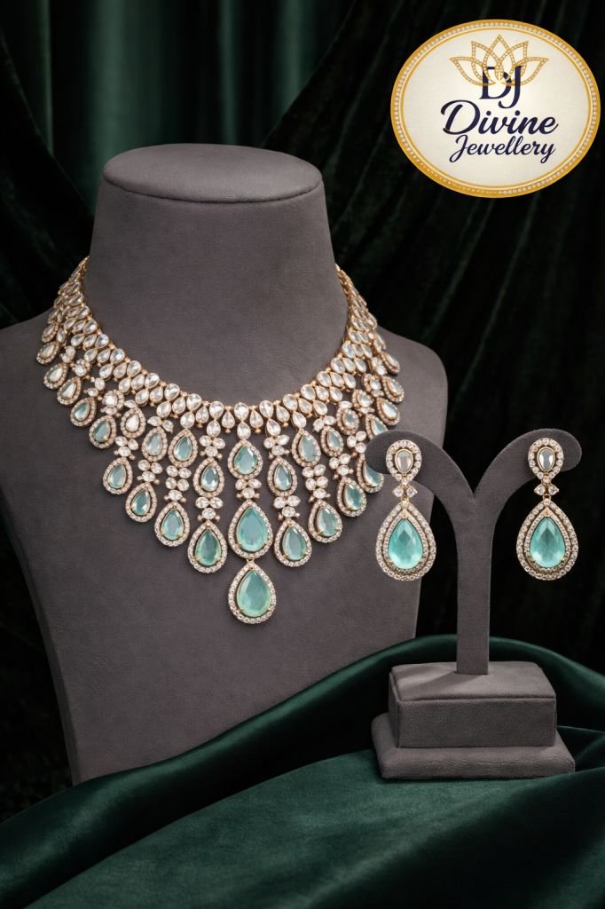 Elegant 92.5 silver rose gold-plated necklace set with aqua crystal drops, high-shine stones, and matching statement earrings. Perfect for receptions & cocktail wear.