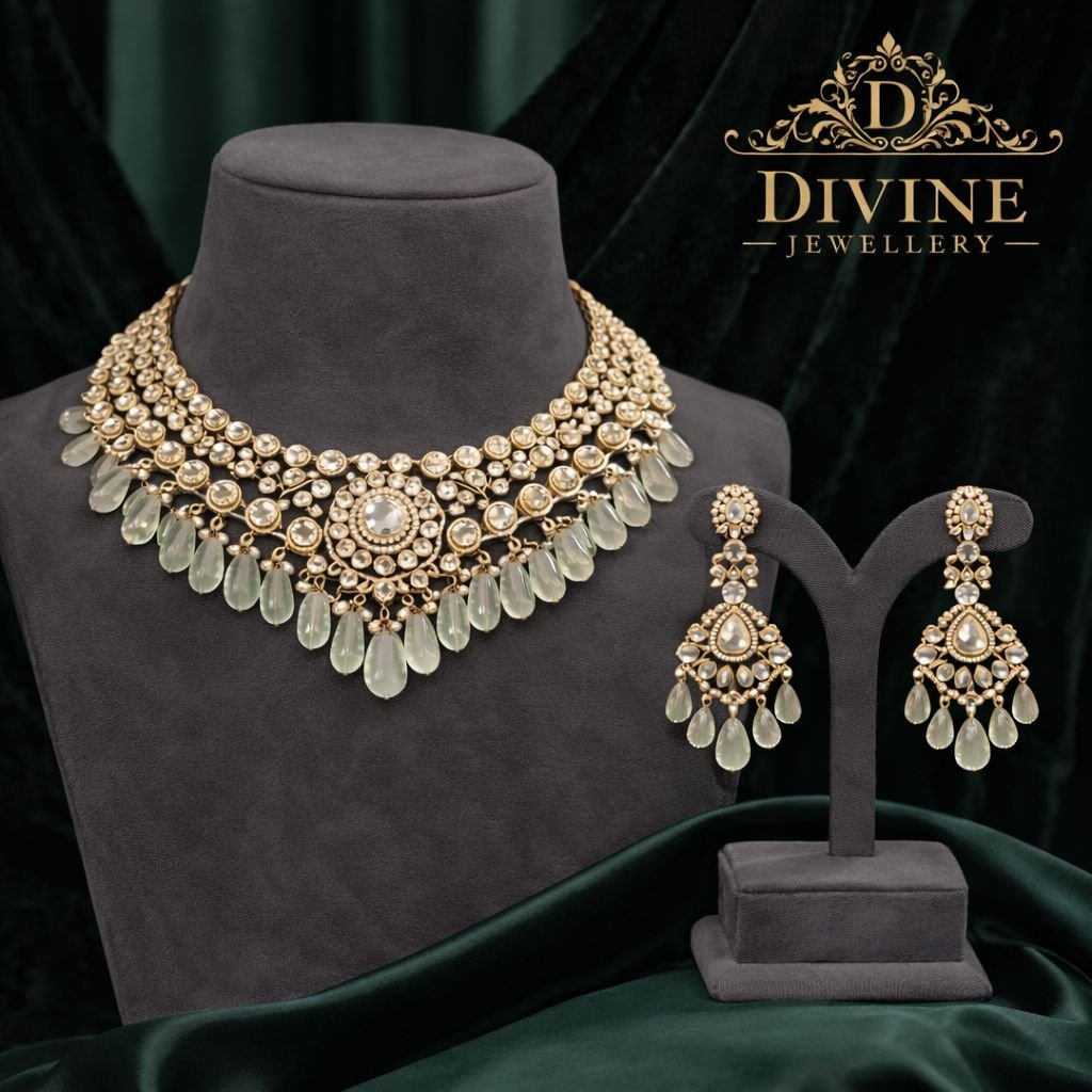 Elegant champagne polki choker with crystal drop detailing and matching statement earrings.
