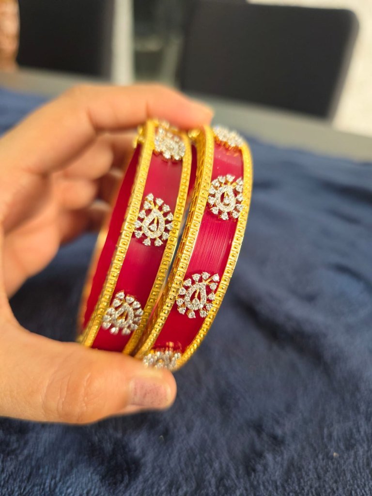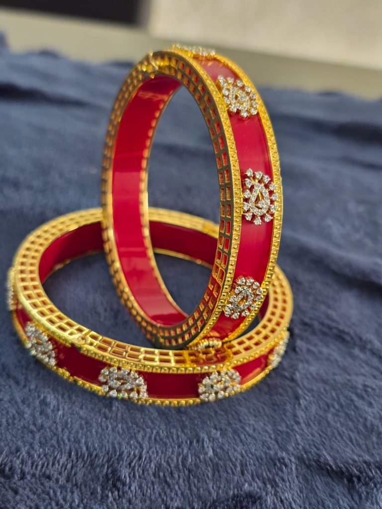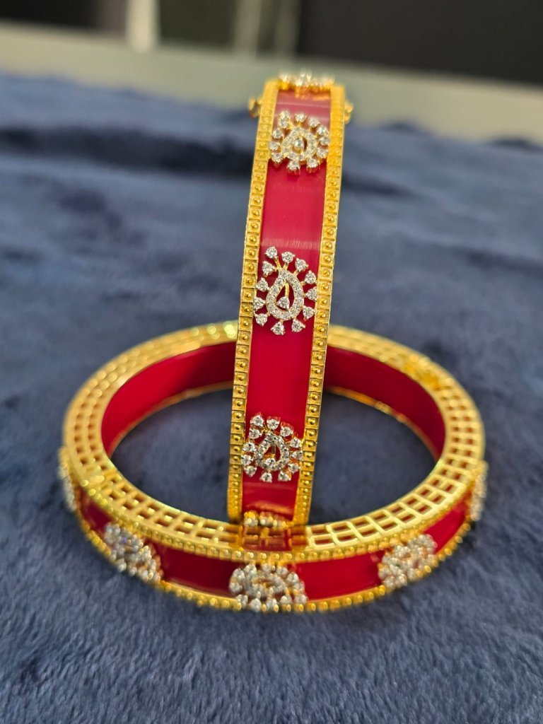 Elevate your jewelry collection with this stunning Royal Crimson Enamel Kada Bracelet, crafted to reflect luxury, tradition, and modern elegance. The bracelet features a rich red enamel base framed with a finely detailed gold-tone structure, highlighted by dazzling diamond-style floral motifs that sparkle beautifully with every movement.