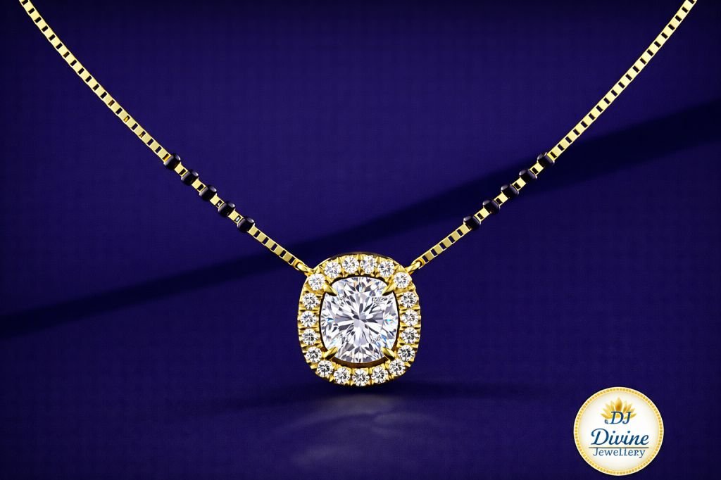 DIVINE 92.5 Sterling Silver Cushion Cut Mangalsutra – 14K Gold Plated Soft-Square Halo Pendant