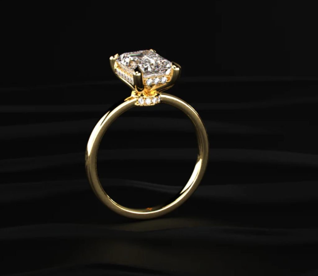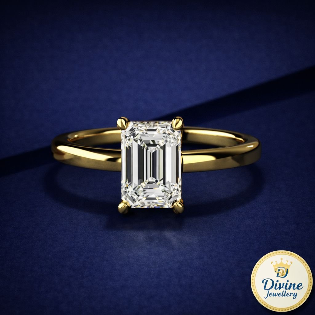 Sophisticated and timeless. This DIVINE original features a large Emerald Cut center stone set in hallmarked 92.5 Sterling Silver with a luxurious gold-plated finish, perfect for those who appreciate understated elegance.