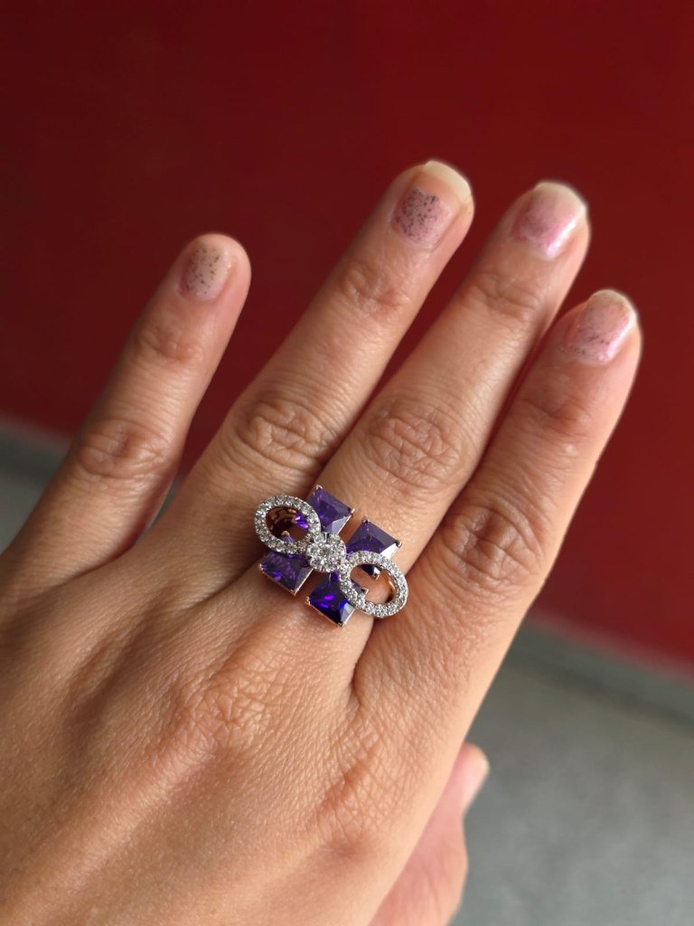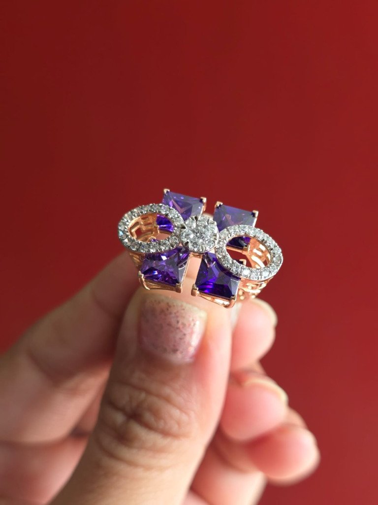 DIVINE “Amethyst Éclat” Couture Ring – Geometric Purple Crystal Statement Ring in Gold Finish