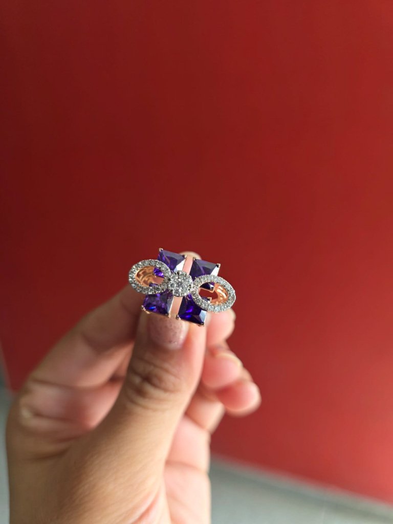 Modern luxury is defined by contrast — structure and softness, light and depth, boldness and restraint. The DIVINE “Amethyst Éclat” Couture Ring is a sculptural expression of that balance. Four faceted amethyst-toned crystals form a striking geometric silhouette, anchored by luminous circular crystal halos that float like points of light. At the center, a brilliant pavé cluster unites the design in radiant harmony. The deep violet stones bring richness and mystique, while the micro-pavé crystal detailing adds refined brilliance. Finished in a warm gold tone, this ring feels architectural yet feminine, powerful yet polished. Designed for women who don’t wear trends — they wear identity. DIVINE creates jewelry that transforms presence into signature.