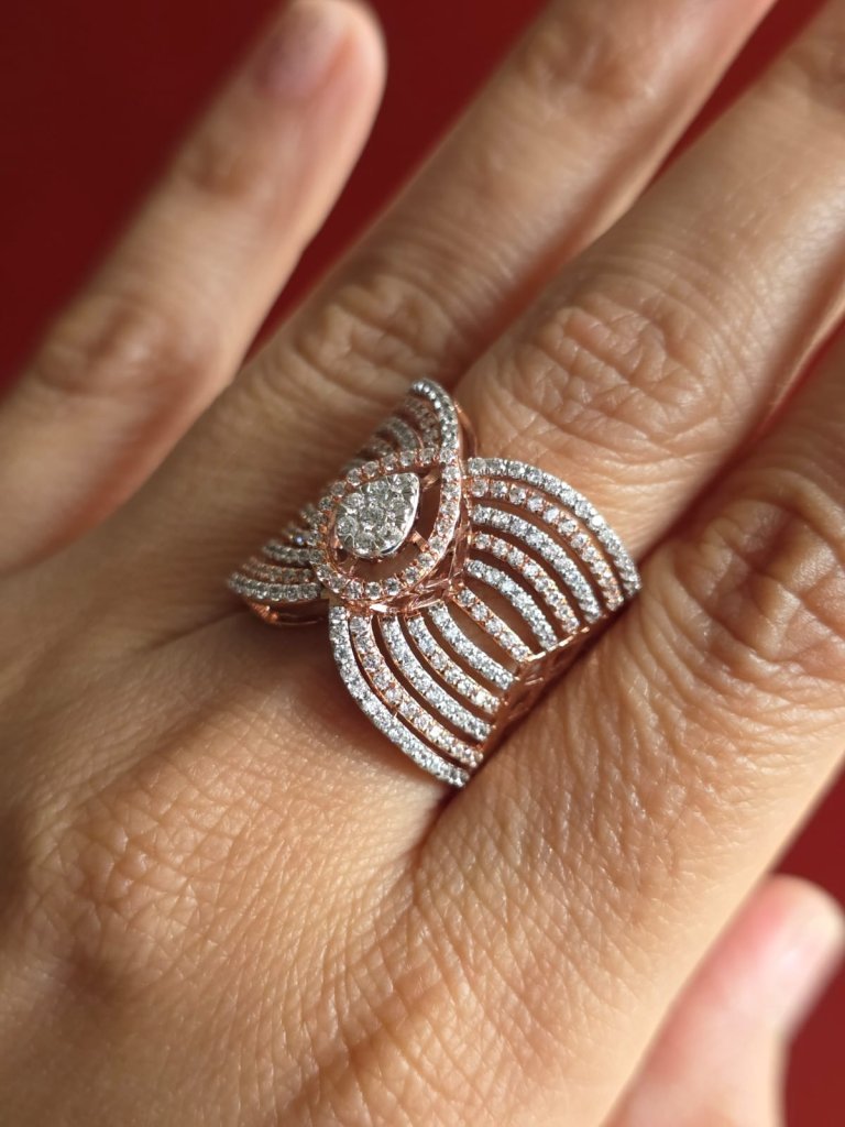 DIVINE “Aurora Wave” Couture Ring – Diamond-Flow Fan Design Statement Ring in Rose Gold Finish
