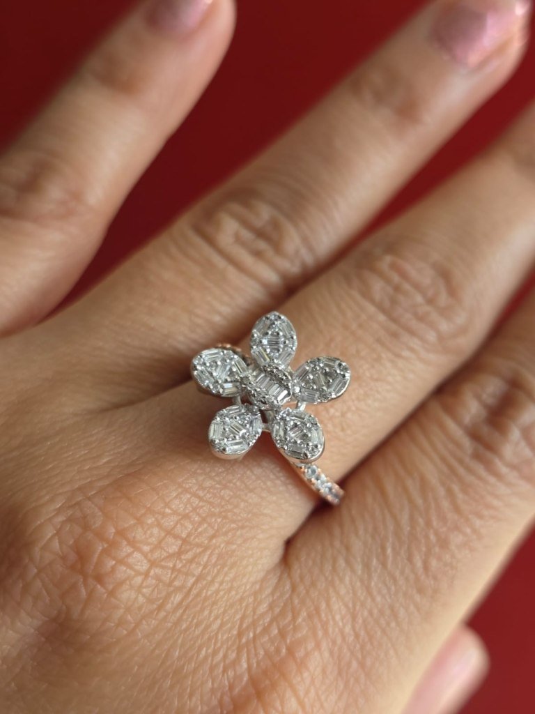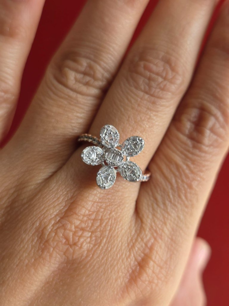 A delicate floral designer ring crafted with baguette and round crystals arranged in a blooming flower pattern. A perfect blend of softness, sparkle and luxury.