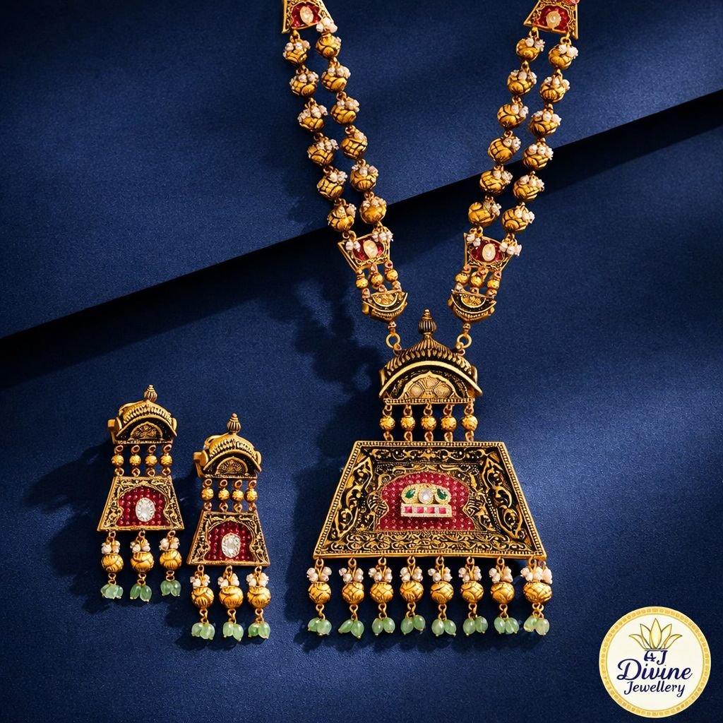Inspired by royal temple architecture, the DIVINE Rajwada Meenakari Temple Pearl Necklace Set is a masterpiece of traditional artistry. The richly detailed pendant showcases classic meenakari craftsmanship paired with antique gold tones, handcrafted beadwork, and soft pearl drops that add regal charm