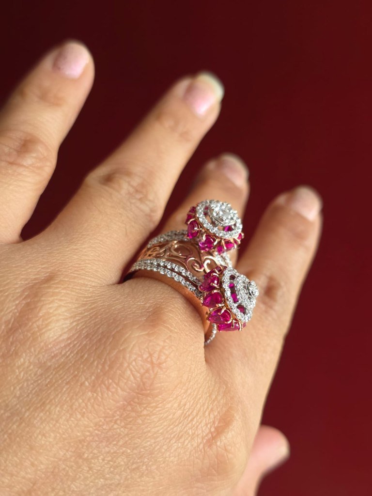 The DIVINE “Rosé Duet” Couture Ring is a celebration of refined drama and modern romance. Designed with two radiant halo medallions, this statement ring features a sculptural openwork band wrapped in warm rose gold tones and illuminated with brilliant white and ruby-hued crystals. Each halo glows like a constellation — layered, dimensional, and alive with light. The architectural filigree band creates a floating effect on the hand, while the ruby accents introduce depth, femininity, and a couture color story. This ring is designed for women who don’t accessorize — they curate. For evenings that demand elegance. For celebrations that deserve presence. For hands that tell stories before words ever do. DIVINE is not fashion jewelry. It is wearable luxury.