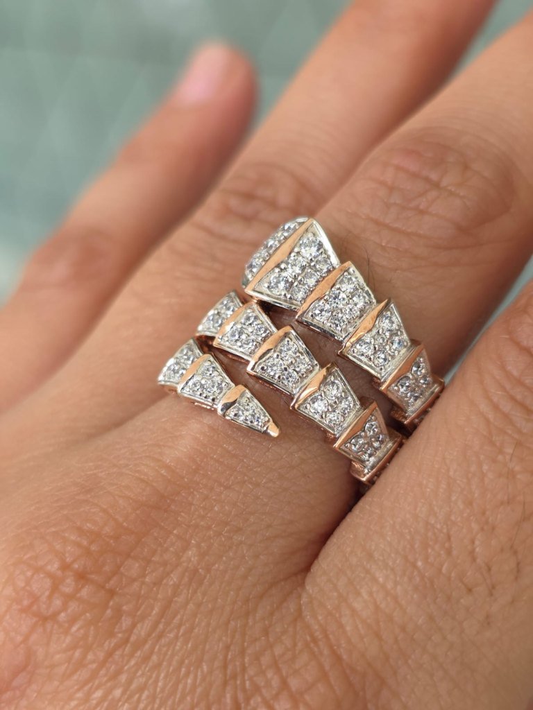 Power has a shape. So does elegance. The DIVINE “Serpente Lumière” Couture Ring draws inspiration from the timeless symbol of transformation and feminine strength. Sculpted in a striking serpent silhouette, this statement ring wraps gracefully around the finger in layered pavé-crystal segments that shimmer with fluid motion. Each faceted panel reflects light like moving scales, creating a luminous rhythm across the hand. The warm rose gold finish softens the bold structure, delivering a balance of sensuality and sophistication. This ring is designed for women who are unapologetic about presence. Who wear confidence as naturally as beauty. Who choose jewelry not to decorate — but to define. DIVINE crafts jewelry that doesn’t follow fashion. It creates identity.
