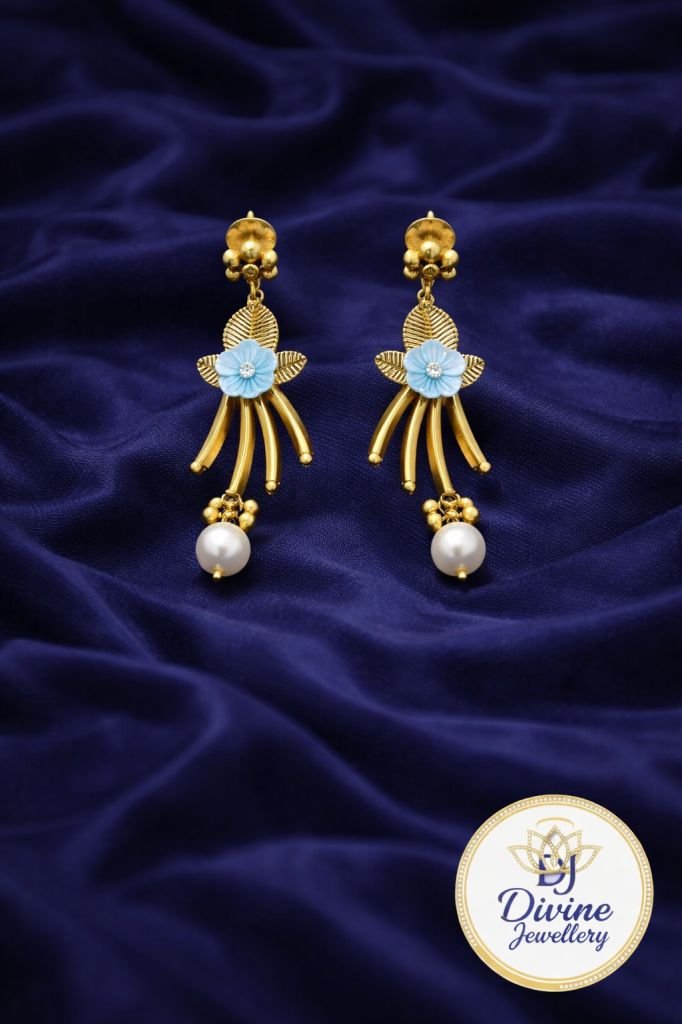 Designer Floral Gold Necklace Set with Blue Enamel Flowers & Pearl Drops – 92.5 Silver Gold Plated