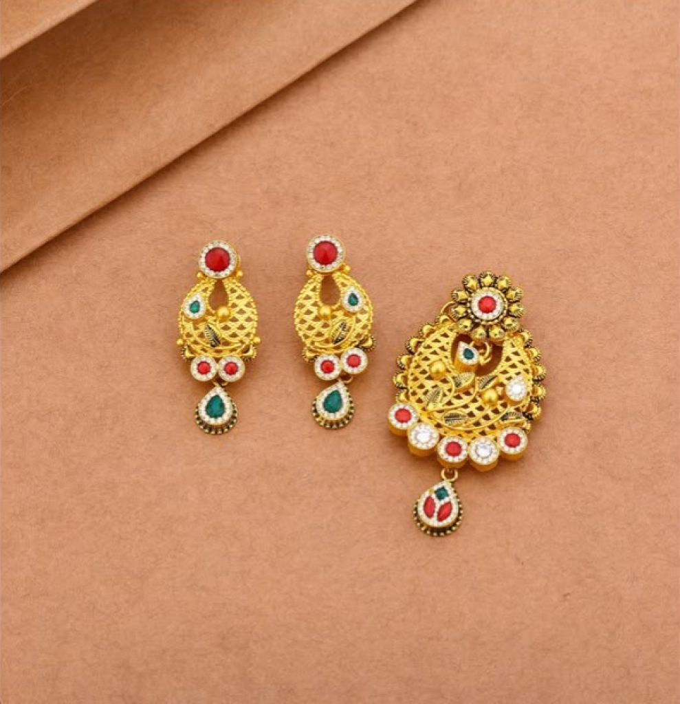 Elegant 92.5 silver gold plated pendant set featuring peacock-inspired jali design, meenakari accents, and matching earrings for a graceful traditional look.