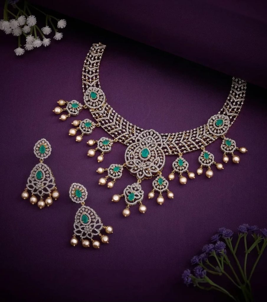 Luxurious bridal choker set crafted in 92.5 silver with gold plating, featuring intricate stone work, rich green accents, and elegant pearl drops for a royal statement look.