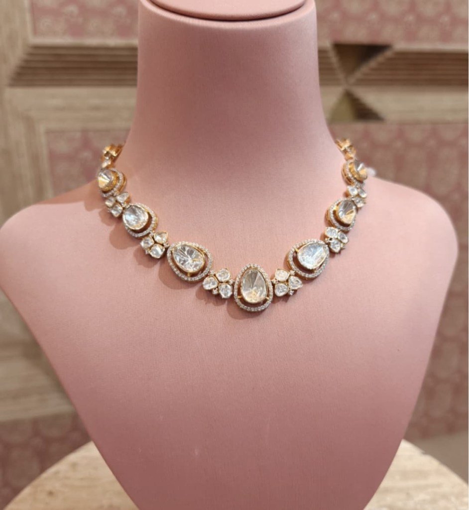 Graceful polki-style necklace set crafted in 92.5 silver with gold plating, featuring teardrop stones and matching stud earrings for a refined minimal look.