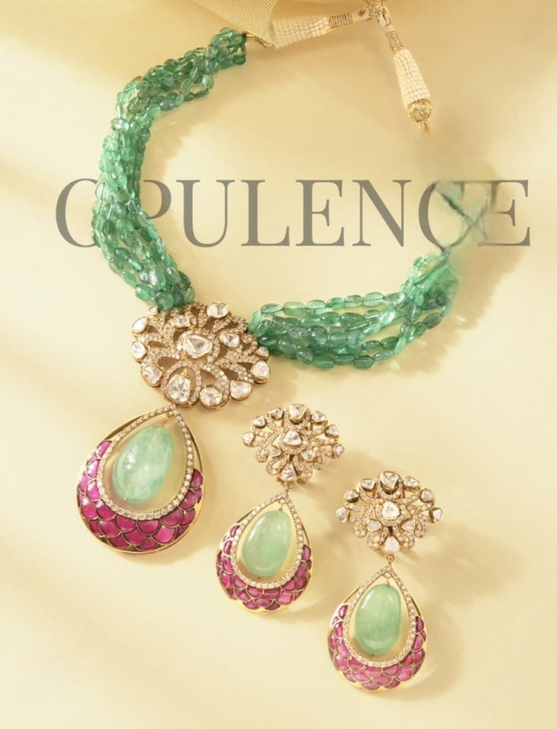Luxury green bead necklace set in 92.5 silver with gold plating, featuring a statement kundan-polki pendant and elegant meenakari teardrop earrings.