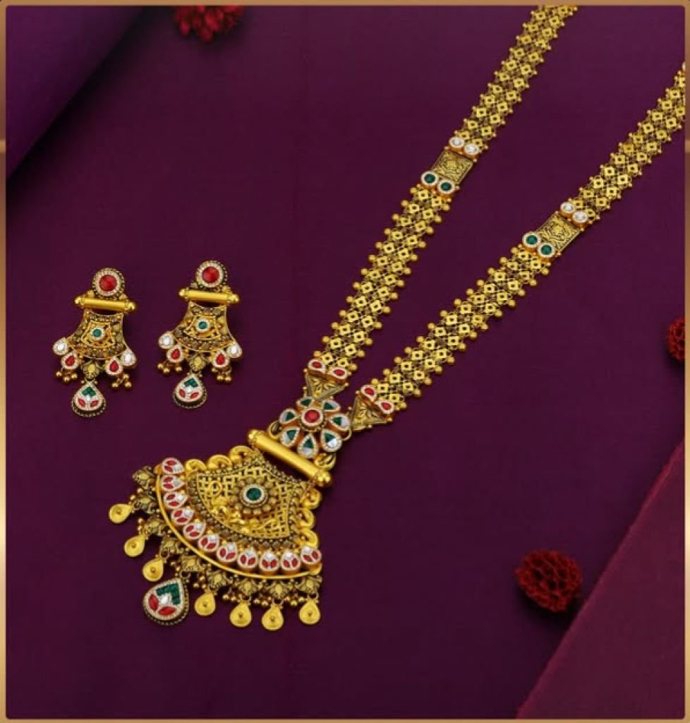 Elegant temple long necklace set in 92.5 silver with gold plating, featuring antique fan-shaped pendant, kundan stones, and matching earrings.