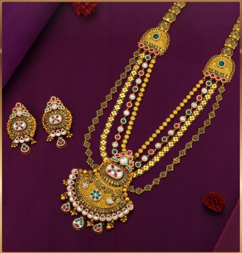 Grand multi-layer temple long necklace set in 92.5 silver with gold plating, featuring antique pendant, kundan stones, and matching earrings.
