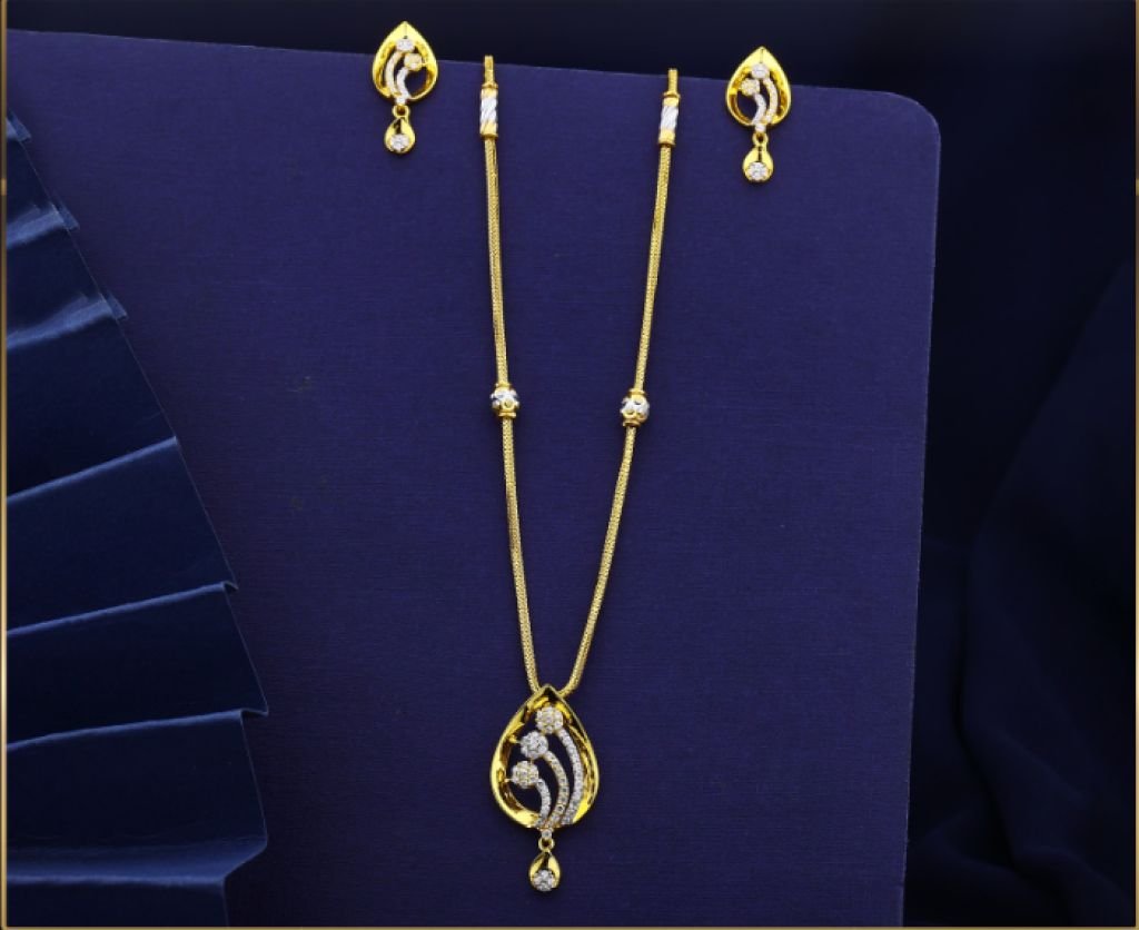 Minimal pendant necklace set in 92.5 silver with gold plating, featuring AD stones and matching earrings.