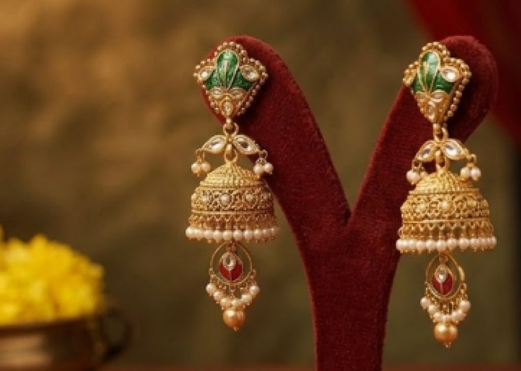 Divine Jewellery 92.5 Silver Gold Plated Bridal Temple Necklace Set with Green Stones, Pearl Layers & Jhumka Earrings