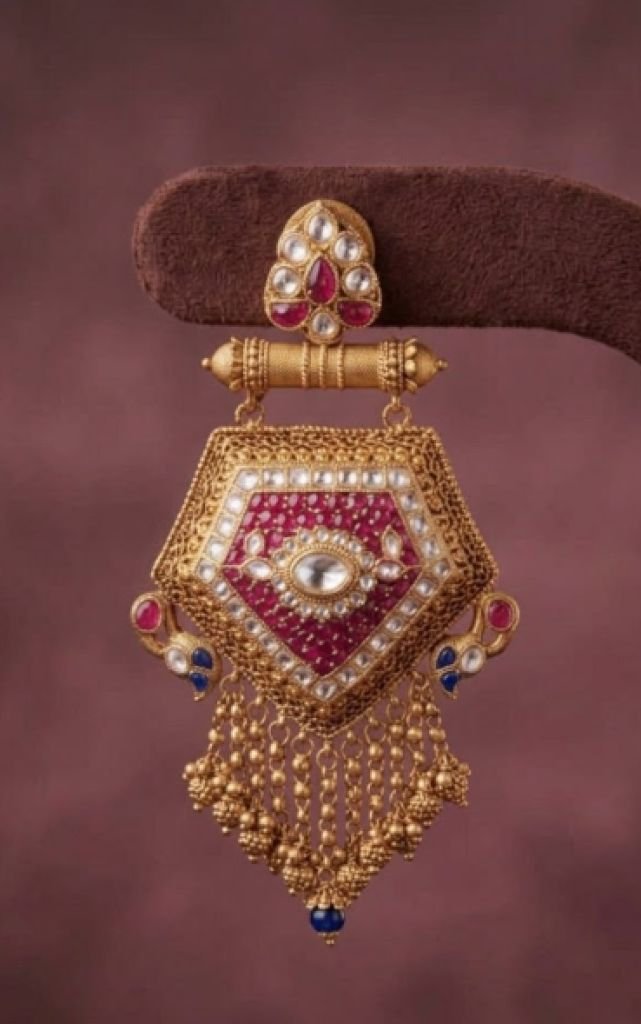 Royal bridal layered necklace set with temple choker, kundan detailing and heavy statement pendant with hanging chains.