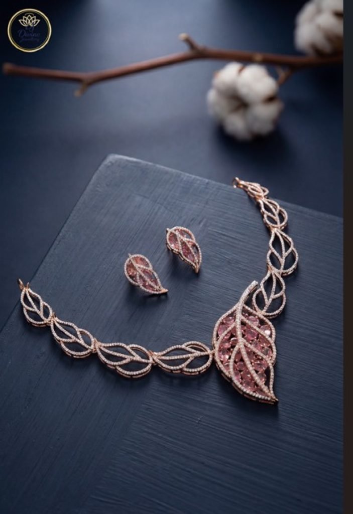 A graceful rose-gold necklace set featuring intertwined leaf motifs and blush pink stone detailing.