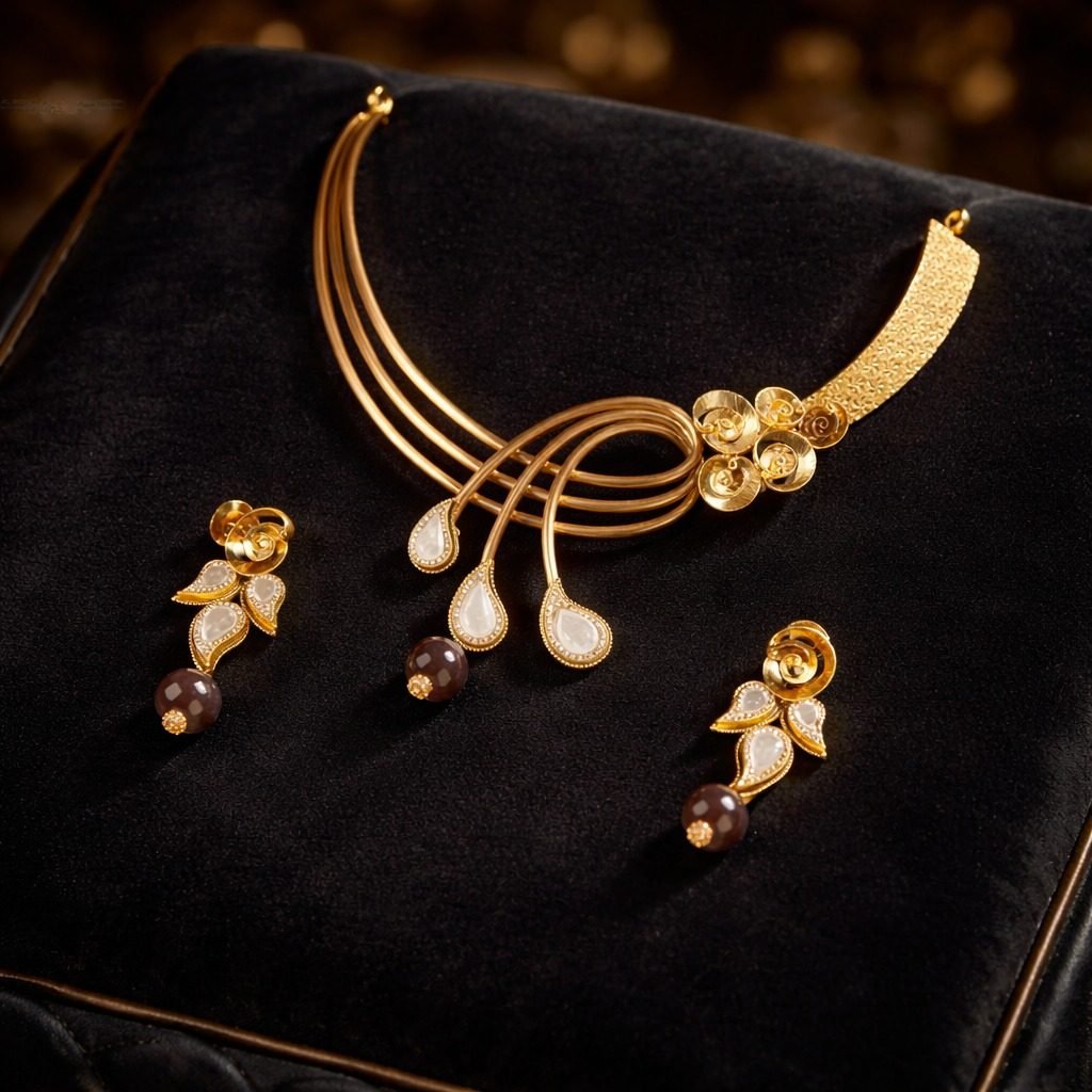 Modern collar necklace featuring elegant gold floral elements, pearl drop accents, and matching designer earrings.