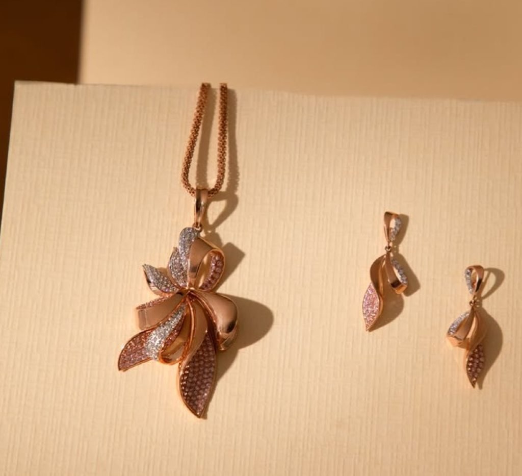 Graceful rose gold-plated 92.5 silver pendant necklace set featuring a blooming petal design with sparkling crystal accents and matching drop earrings.