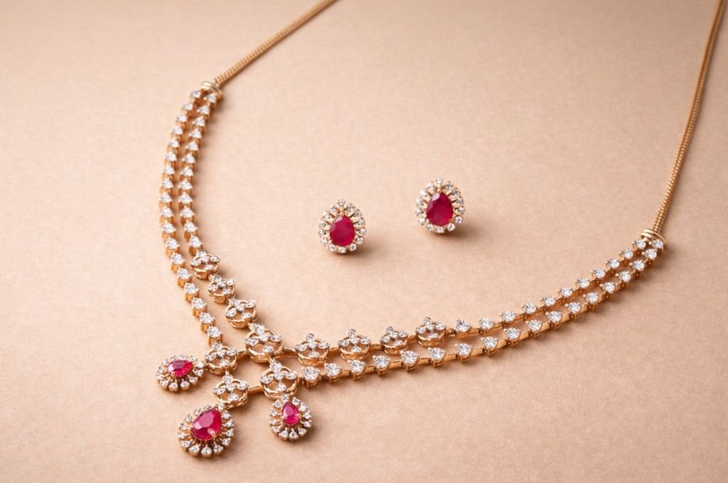 Divine Jewellery Elegant Ruby Drop Necklace Set with Crystal Floral Design and Matching Stud Earrings