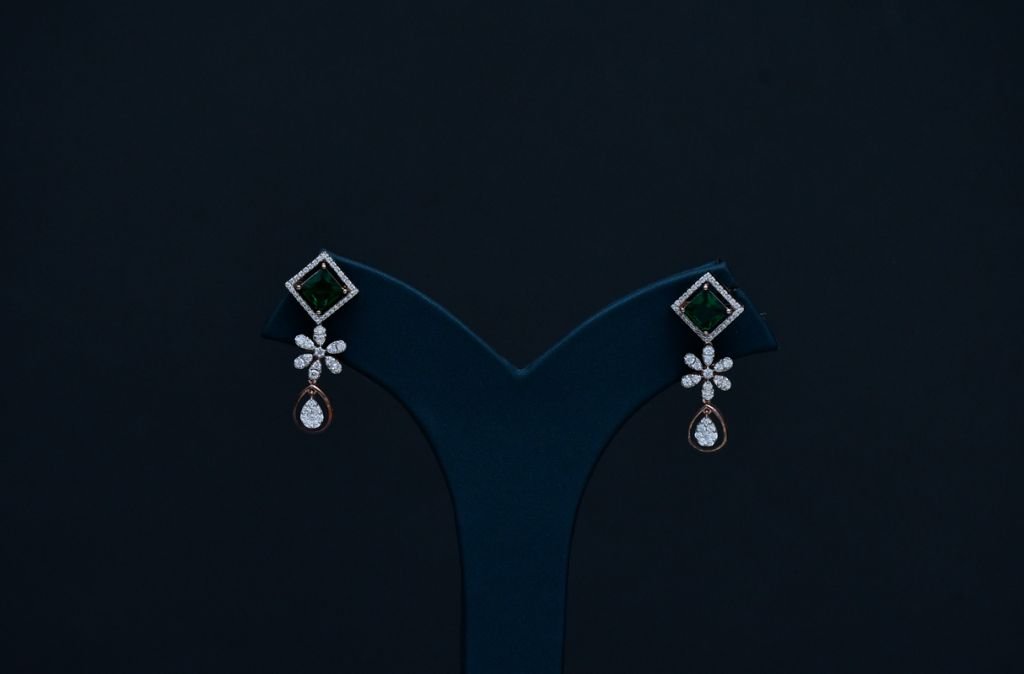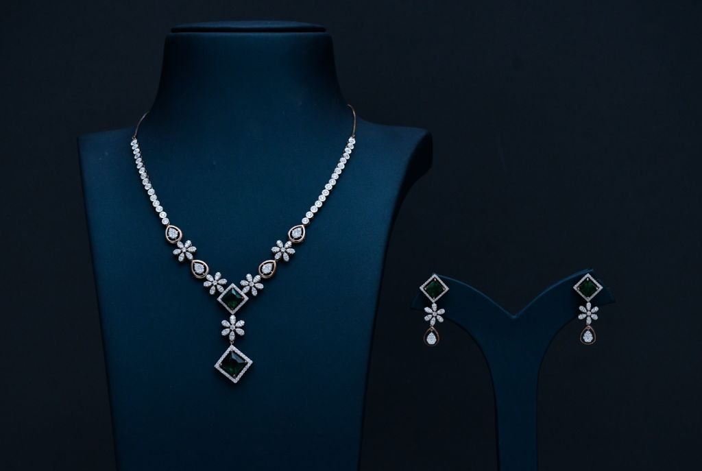 A refined floral diamond-style necklace set featuring emerald green center stones with matching drop earrings.