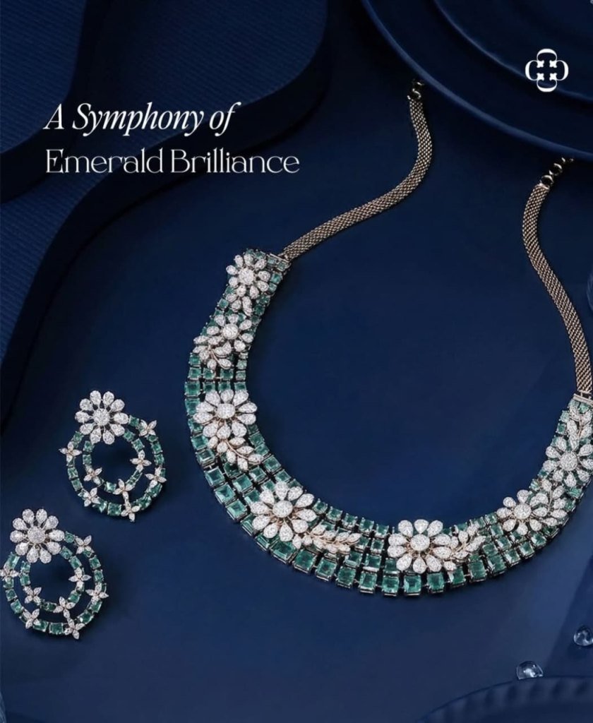 Luxurious gold-plated 92.5 silver necklace set featuring emerald green stones, sparkling crystal floral motifs, and elegant matching statement earrings.