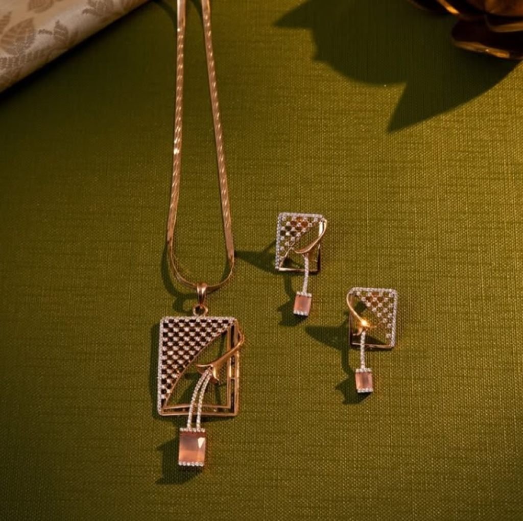 Modern geometric pendant necklace set featuring crystal lattice detailing and stylish contemporary earrings.