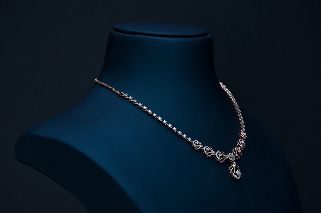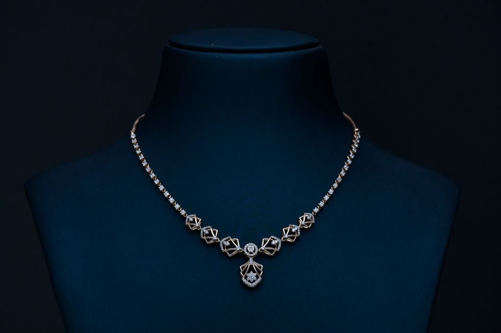 A refined geometric necklace set featuring structured motifs and brilliant stone detailing for modern elegance.