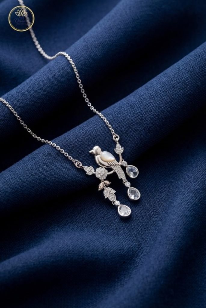 A graceful bird-motif pendant necklace featuring pearl detailing, diamond-style accents, and elegant drop stones.