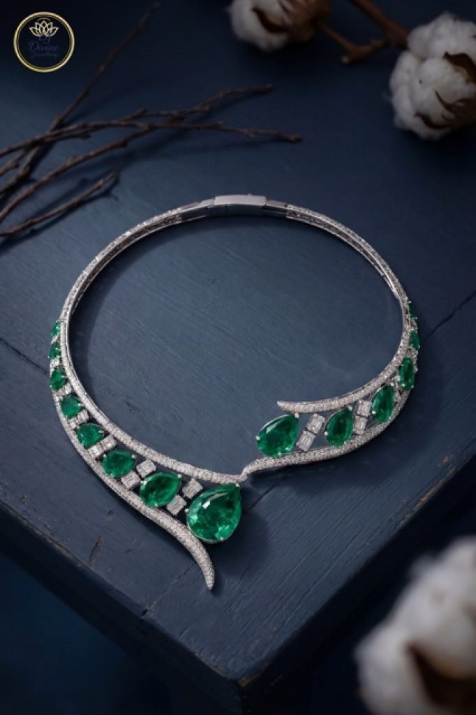 A striking emerald drop collar necklace adorned with diamond-style brilliance and sculpted modern elegance.