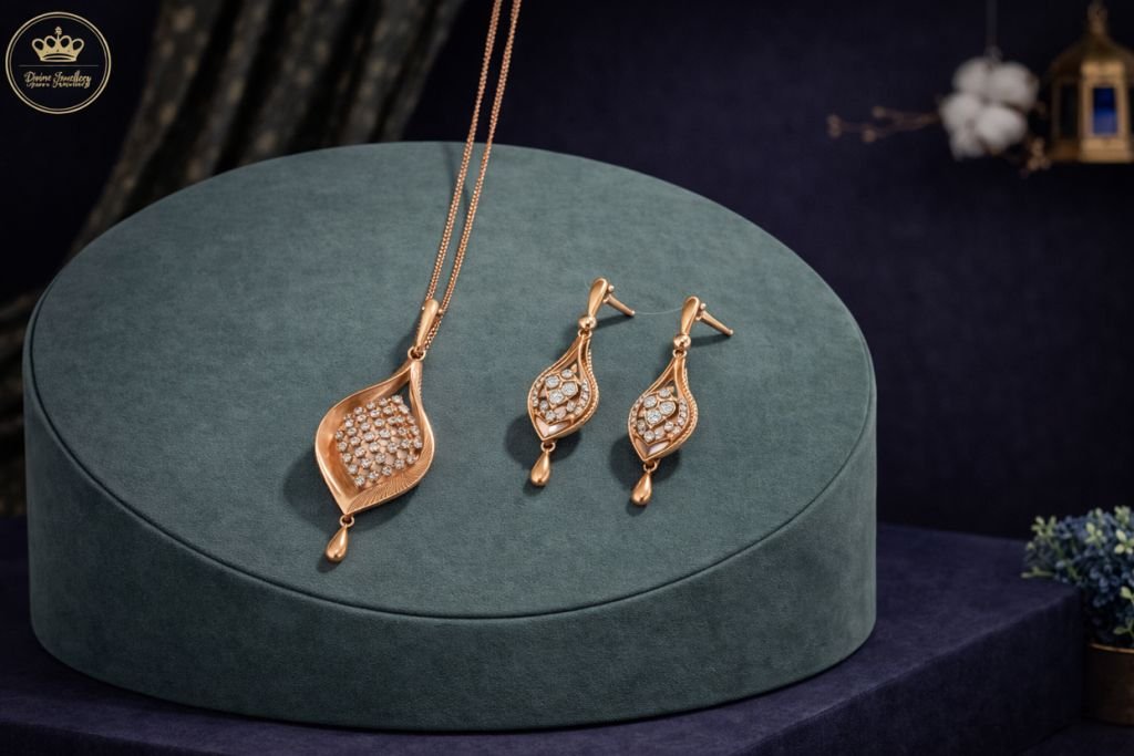 Divine Jewellery Rose Gold Leaf Crystal Pendant Necklace Set with Drop Earrings