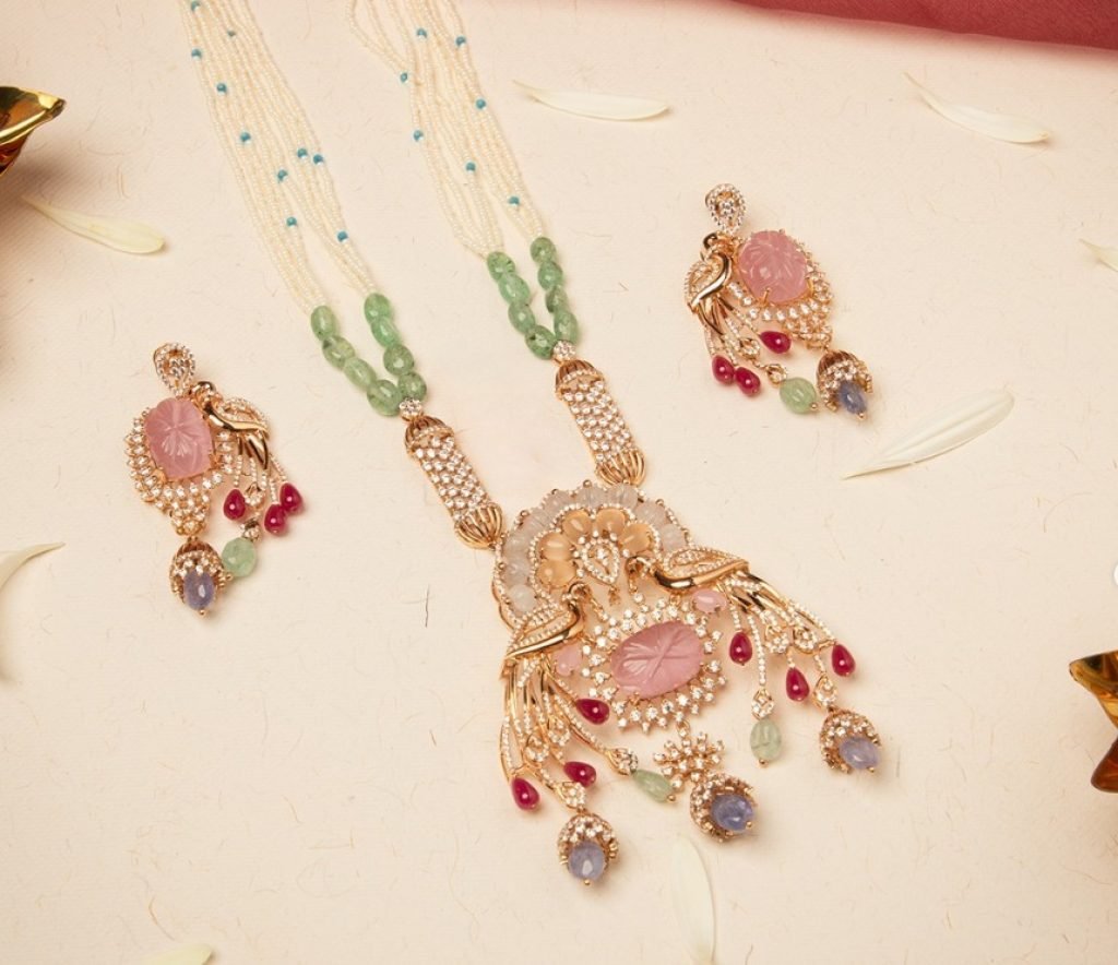 Elegant rose quartz pendant necklace set featuring multi-strand pearl beads, pastel gemstones, and designer statement earrings.