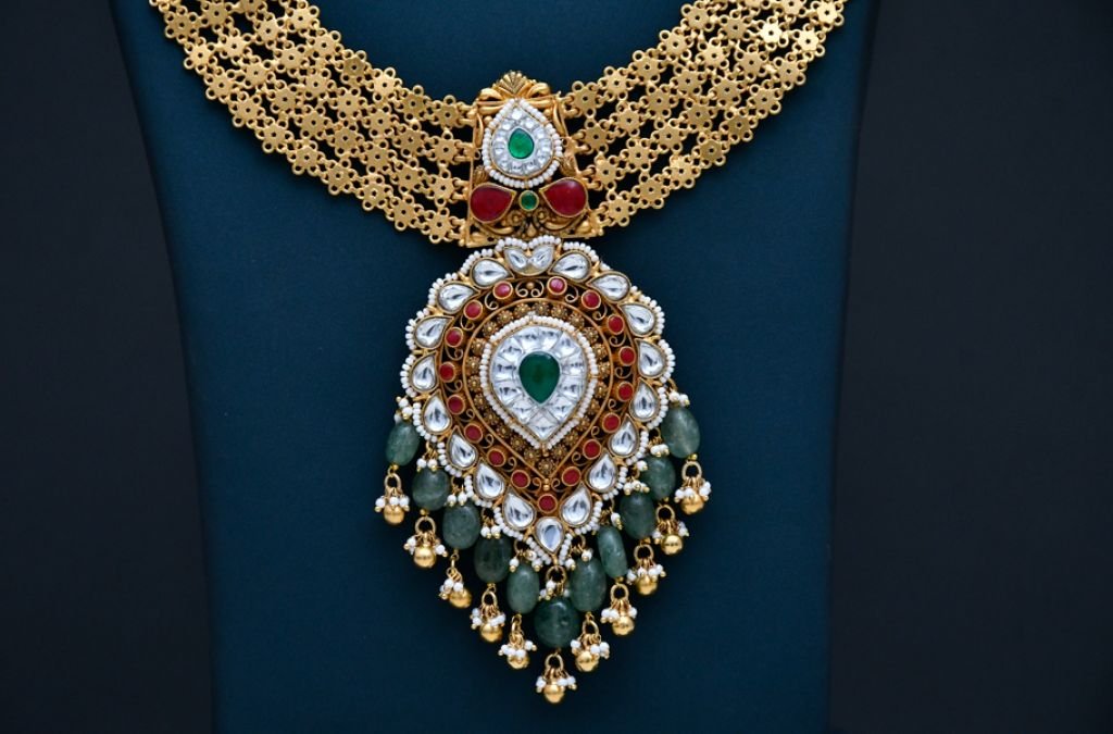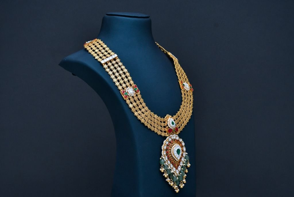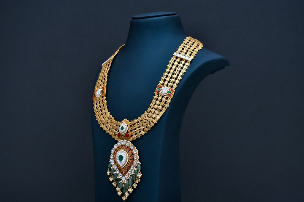 A majestic long bridal necklace featuring intricate filigree layers, polki-style detailing, ruby accents, and emerald drop embellishments.