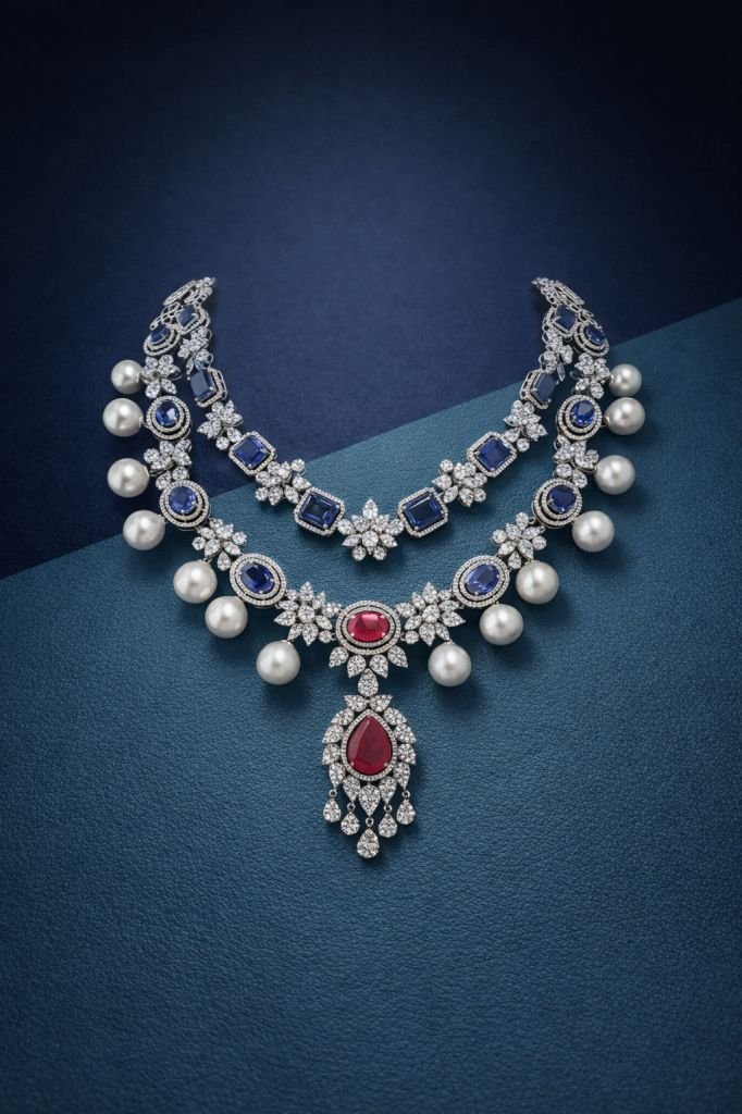 A majestic bridal necklace set featuring deep sapphire-blue stones, luminous pearl drops, and a striking ruby centerpiece.
