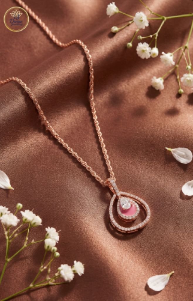 A delicate ruby drop pendant framed with sparkling crystal halos, set in an elegant rose gold plated silver design.