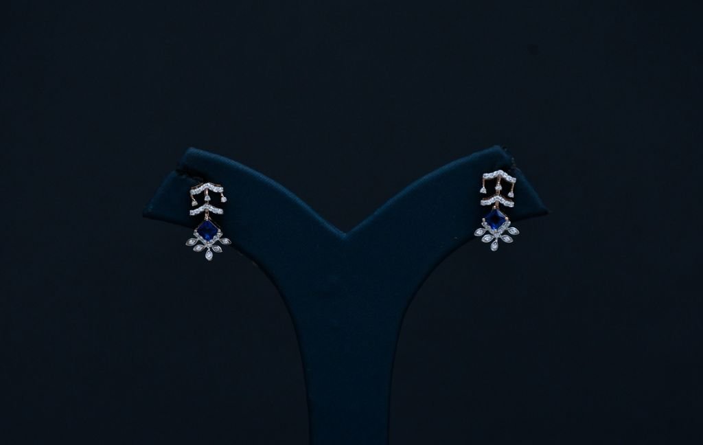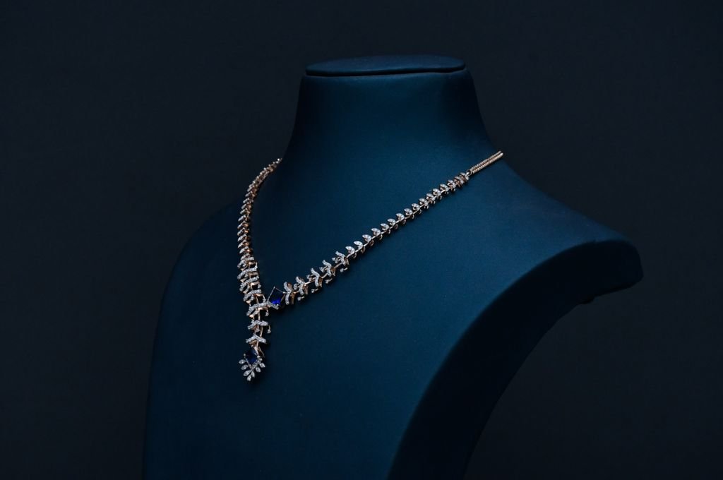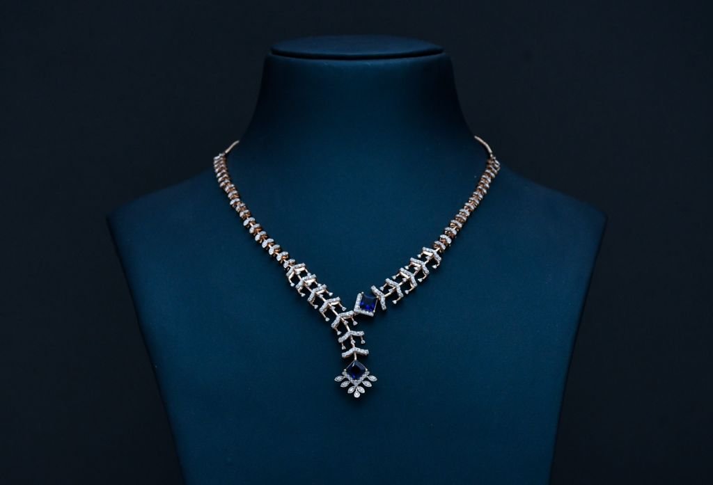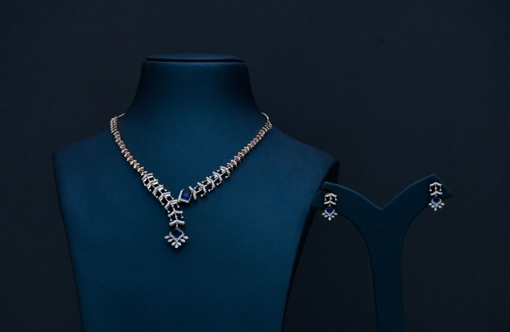 A sleek diamond-style necklace set highlighted with deep sapphire-blue stones and matching drop earrings.