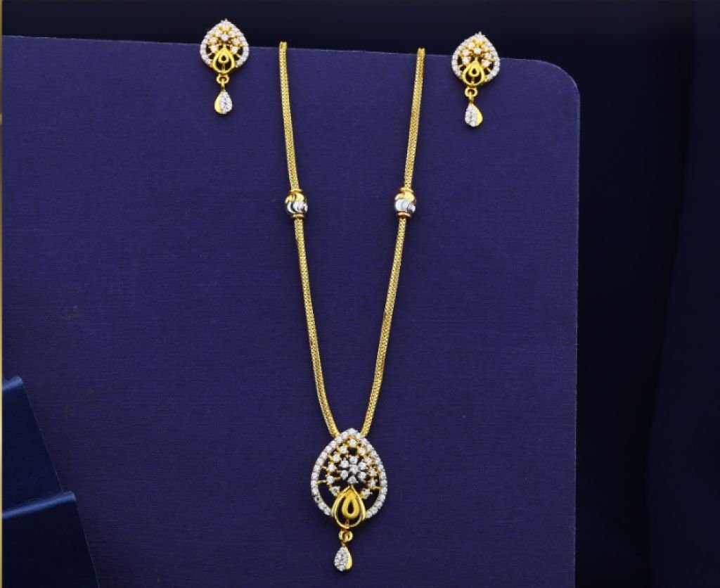 Stylish 92.5 silver gold-plated pendant necklace set featuring floral CZ design with matching earrings. Perfect for daily and party wear.