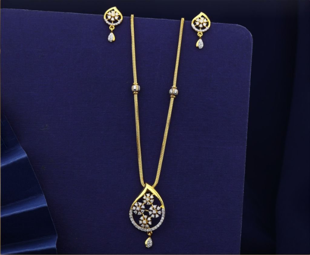 Stylish 92.5 silver gold-plated pendant necklace set featuring teardrop floral CZ design with matching earrings. Perfect for daily and party wear.