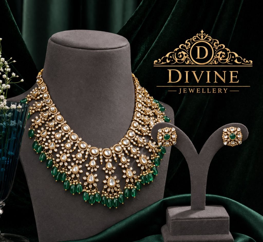 Elegant kundan choker with emerald bead drops and classic royal detailing.