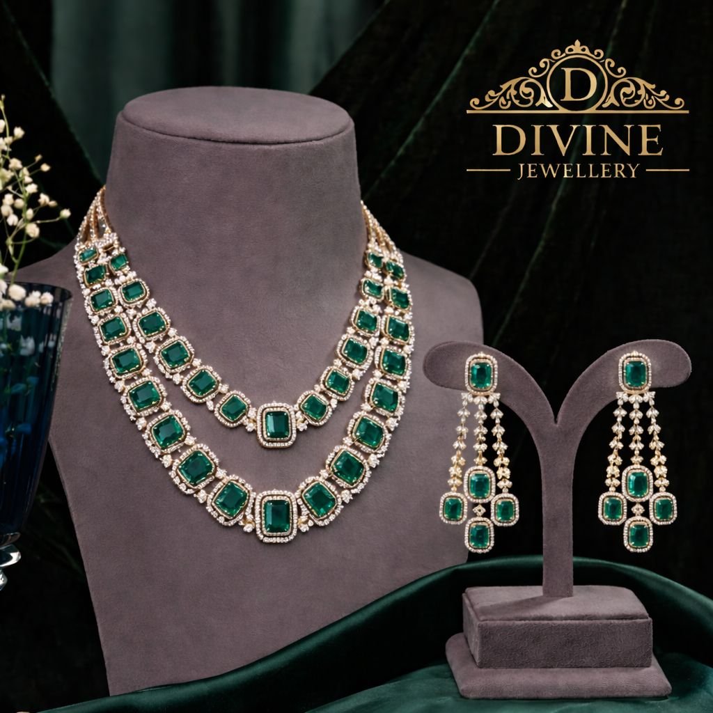 A stylish multi-layer necklace set featuring geometric emerald stones with sparkling accents, crafted in 92.5 silver with premium gold plating. Perfect for modern bridal and party wear.