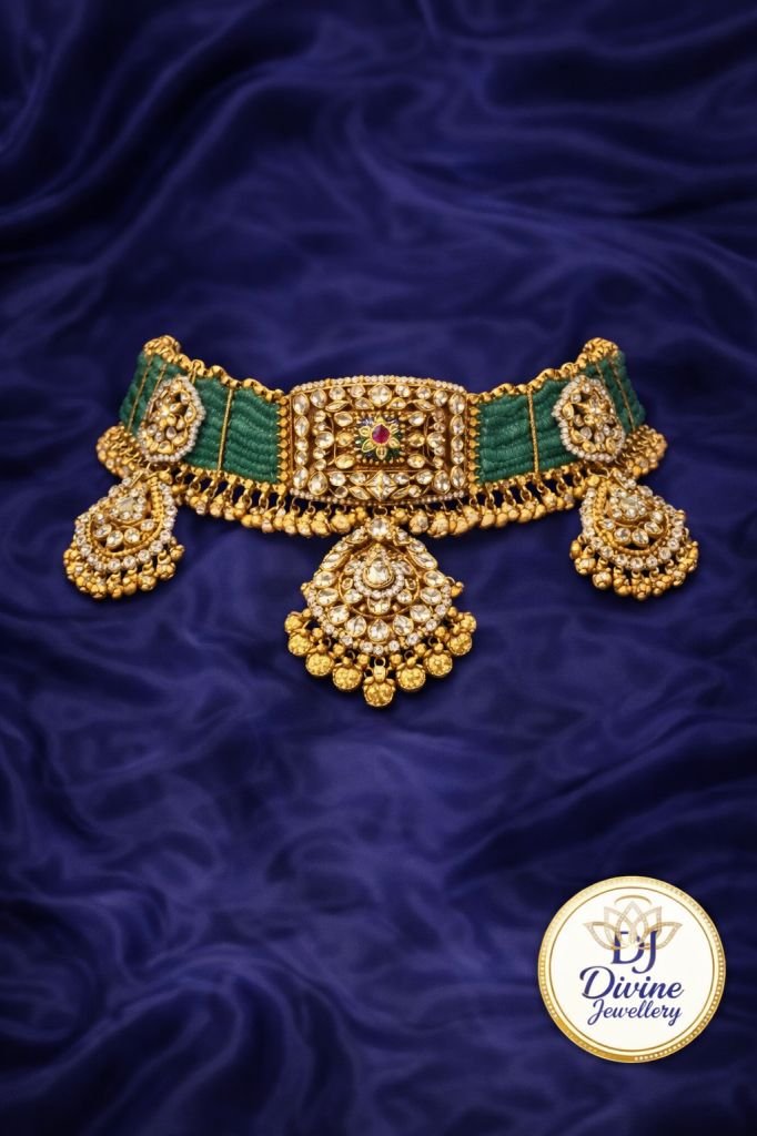 Emerald Rajwada Choker Necklace Set with Kundan Drops & Jhumka Earrings – 92.5 Silver Gold Plated Bridal Jewellery