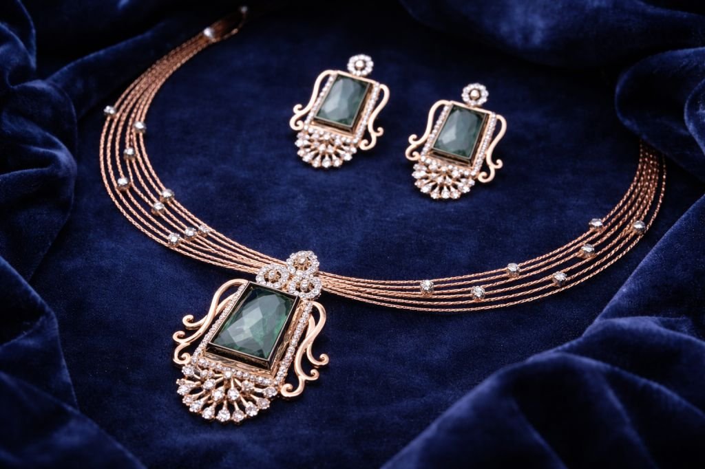 Emerald Statement Pendant Necklace Set – 92.5 Silver Rose Gold Plated Multi-Strand Jewellery