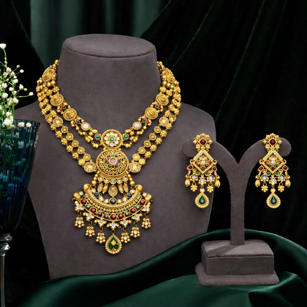Grand Multicolor Temple Necklace Set with Layered Chains – 92.5 Silver Gold Plated Bridal Jewellery | Divine Jewellery