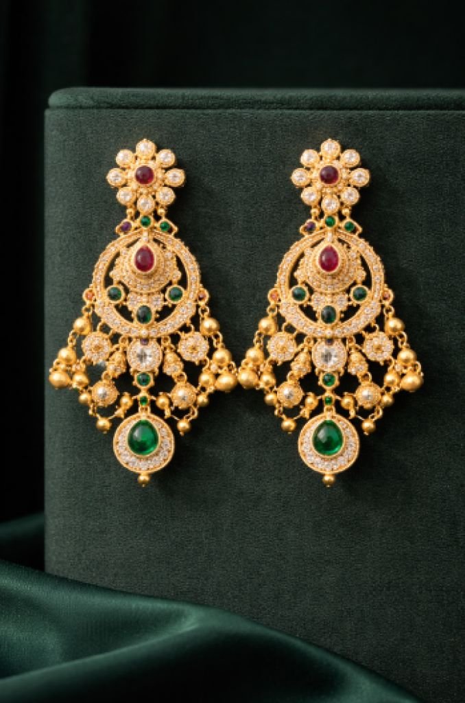 Heavy temple-style multilayer necklace with intricate pendant and matching earrings, crafted in 92.5 silver with gold plating—perfect for bridal and festive wear.