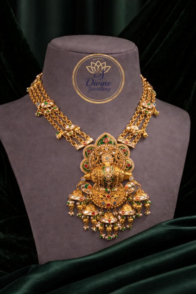Heavy temple long necklace with royal pendant, multi-layer chain & jhumka earrings in 92.5 silver gold plating—perfect for bridal & festive wear.