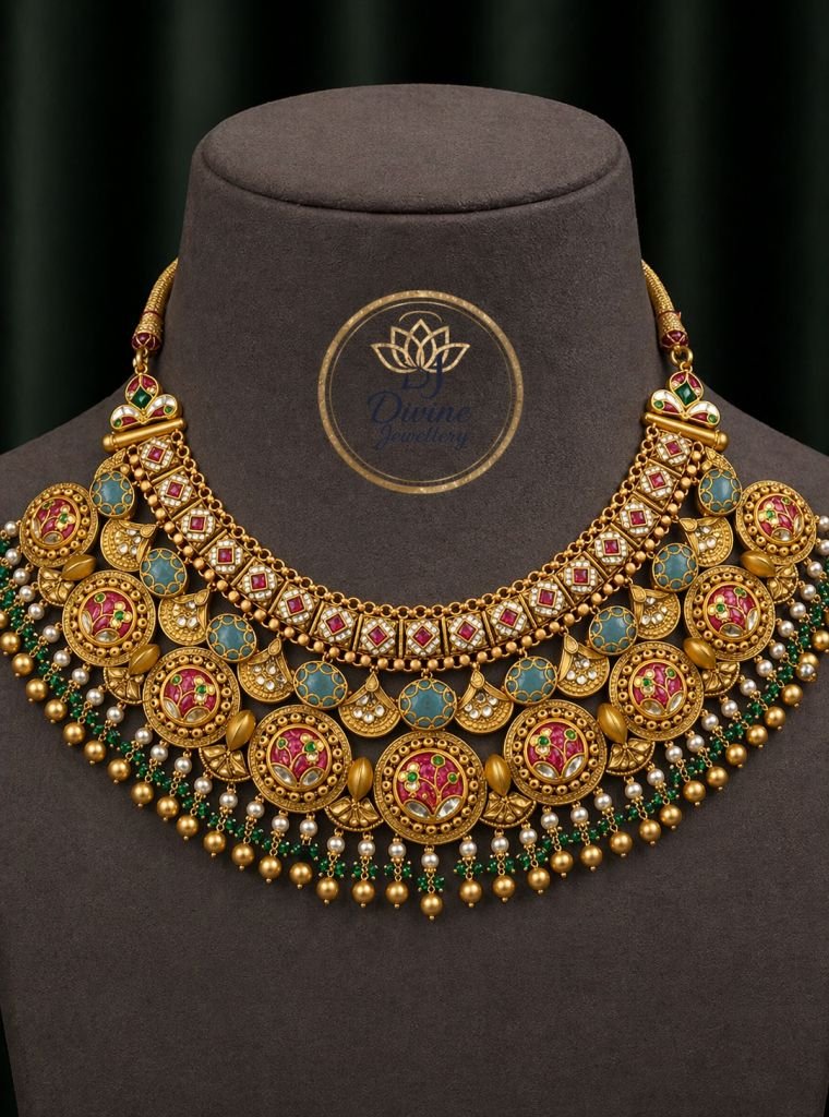 Heavy royal temple necklace with meenakari coin design.