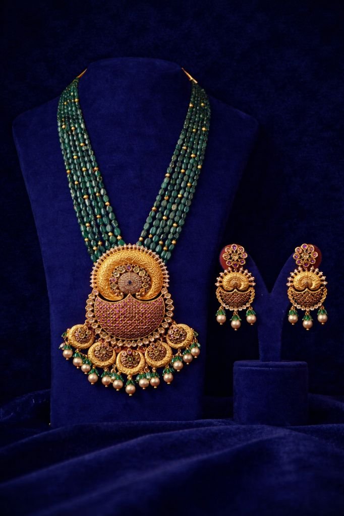 Grand temple-style necklace set with multilayer green beads, heavy pendant, and intricate detailing for a royal bridal look.